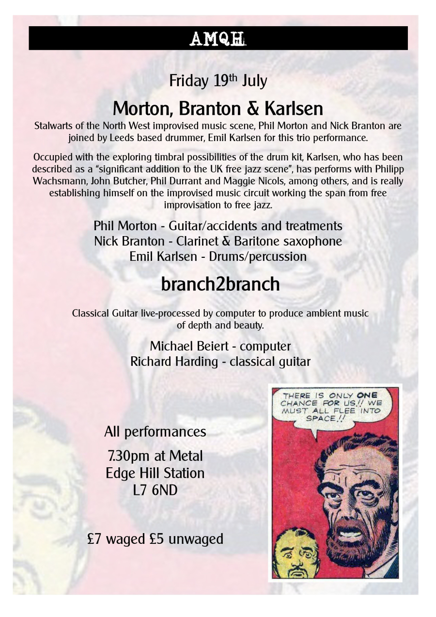 Stalwarts of the North West improvised music scene,PhilMorton and Nick Branton are joined by Leeds based drummer, Emil Karlsen for this trio performance.