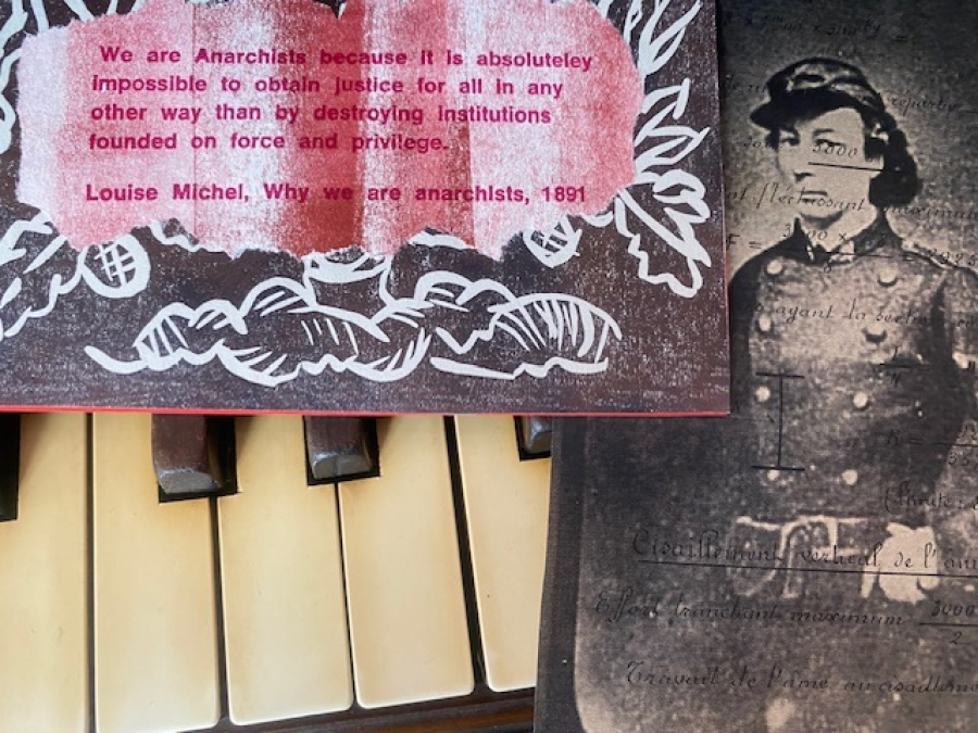 Working with handprinted letterpress, salvaged packaging, discarded books, old maps and other found printed and paper ephemera, the exhibition features a series of ‘pocket pamphlets’, notebooks, mini-posters and other printed items that highlight the politics, ethics and aesthetics of working with ‘rubbish’. With a new series of pamphlets, it focuses on Resonating Women of the Paris Commune a ten week online project in 2021 (the Commune’s 150th anniversary year) that celebrated les petroleuses. Each week featured a dedicated letterpress print to ‘name’ a woman communard, provided research and a short freely improvised sonic piece.