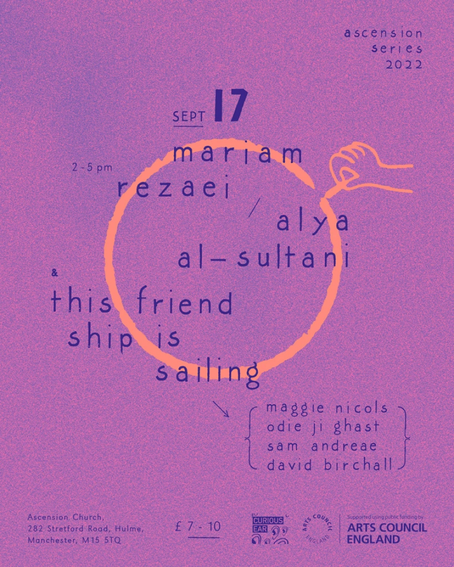 “Mariam and Alya come from different but overlapping disciplines. After growing up as a classically trained pianist, Mariam has built a reputation over time as a prolific turntablist, DJ and improvisor, never shying away from interdisciplinary and experimental projects. Alya meanwhile is a British-Iraqi soprano, but has spent the last few years integrating improvisational techniques, microtonal ideas and Eastern influences in her music. Together their dexterous lungs and nimble fingers birth forms that dance in and out of each other: shifting, soaring, dipping, diving, but never sitting still.” From Cafe Oto website.Alongside this we have only the second ever in real life performance from This Friend Ship Is Sailing which features Maggie Nicols alongside Odie Ji Ghast on vocals, Sam Andreae on saxophone and electronics and David Birchall on guitar. The groups debut release on Beartown Records was described by Free Jazz blog as, “great… both sessions feel like long stories that follow a thread… One the best albums I’ve heard in a while”