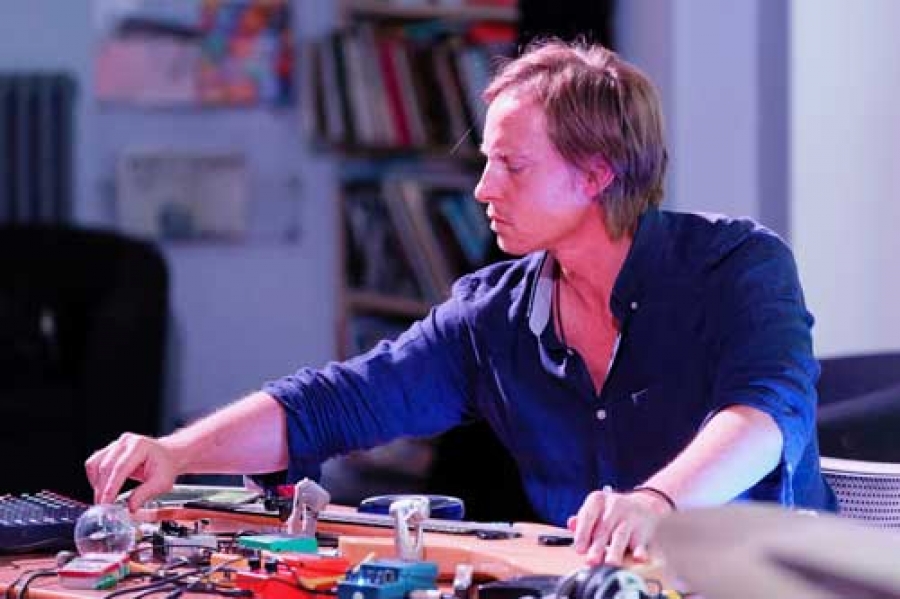 Although originally trained as a guitarist, Thompson has worked with live electronics for the better part of 15 years. Since 2016/17, however, he has returned to guitar using one built by Moog combining built in electronics with miscellaneous table top devices, found objects, flashing lights, and the occasional vibrator.