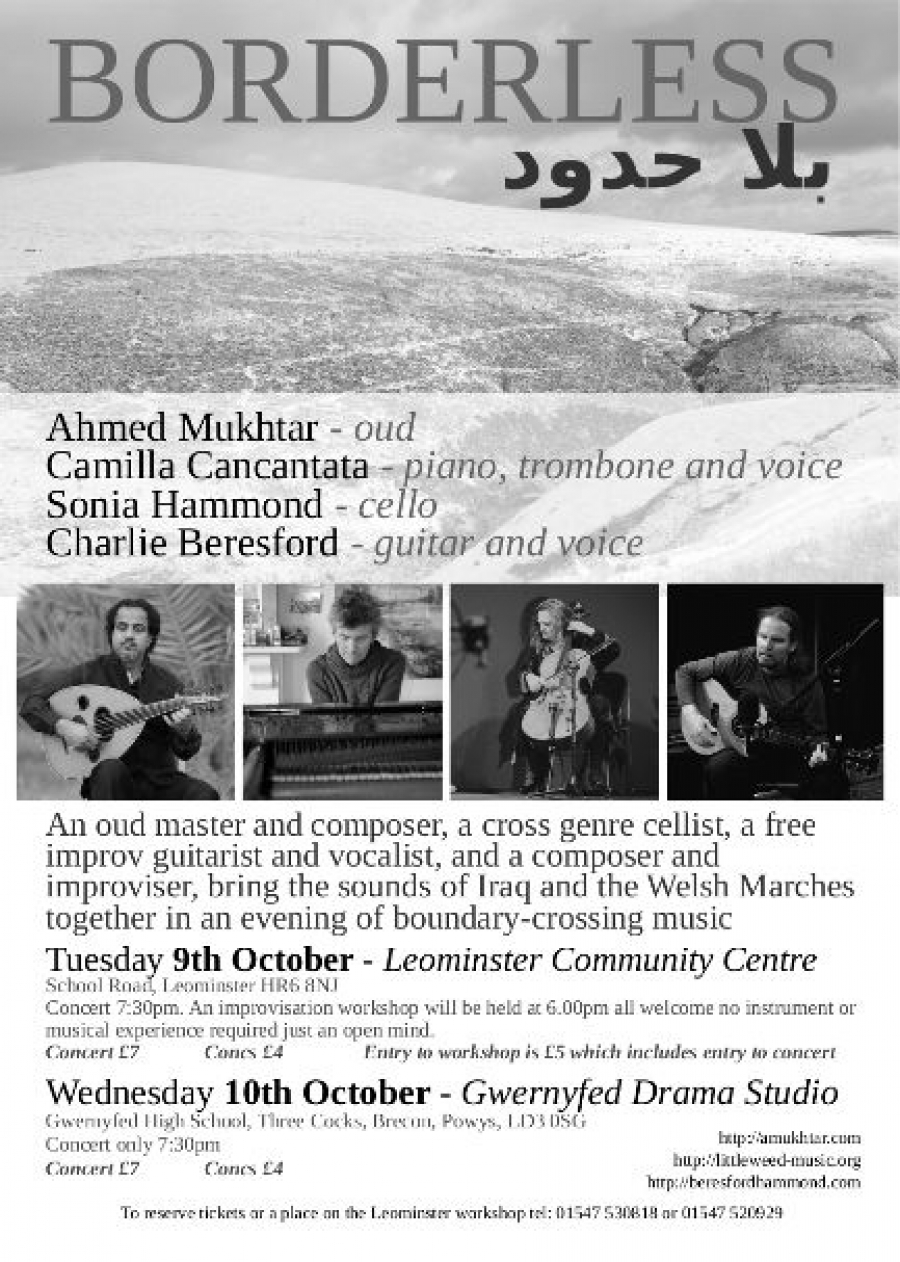 They will be giving two public concerts: Leominster Community Centre, Tue Oct 9 th , and Gwernyfed Drama Studio, Gwernyfed High School, near Hay, Wed Oct 10th . The concerts will feature Ahmed’s own compositions and improvisations, the other instrumentalists’ responses, and different groupings of musicians playing, culminating with all four improvising freely. There will also be a workshop, open to all, before the concert in Leominster. No instrument or musical experience required. In the workshops the musicians will demonstrate different improvising techniques and encourage participants to explore new rhythms, tonalities and sound worlds. The concerts will explore the interaction between the players when they are all listening to and responding to each other, venturing into new musical territory and pushing out of their comfort zones – which will mean something different for each musician. Music from very different cultures is not necessarily a universal language, but through improvisation we can find a common thread linking the varied cultural traditions and musical