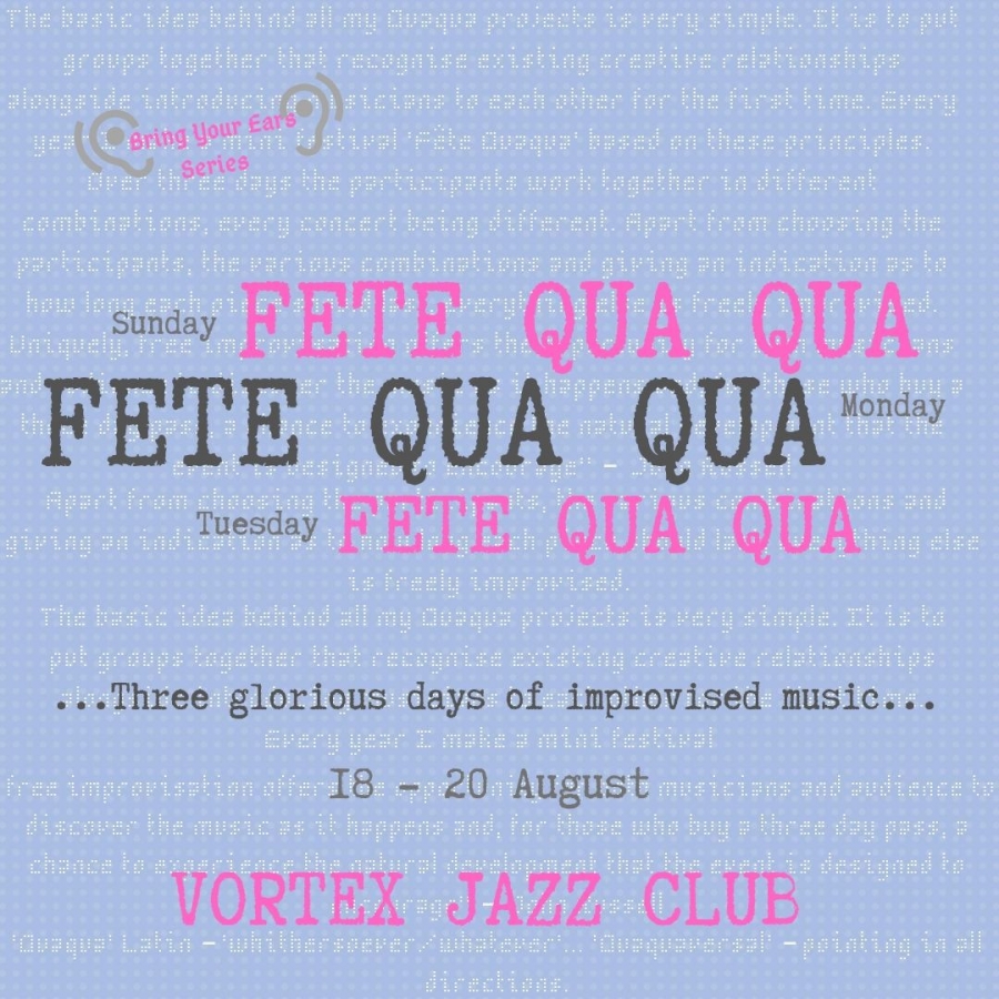 ‘The basic idea behind all my Quaqua projects is very simple. It is to put groups together that recognise existing creative relationships alongside introducing musicians to each other for the first time. Every year I make a mini festival ‘Fête Quaqua’ based on these principles. Over three days the participants work together in different combinations, every concert being different. Apart from choosing the participants, the various combinations and giving an indication as to how long each piece should last everything else is freely improvised. Uniquely free improvisation offers the opportunity for both musicians and audience to discover the music as it happens and for those who buy a three day pass a chance to experience the natural development that the event is designed to encourage’ John Russell